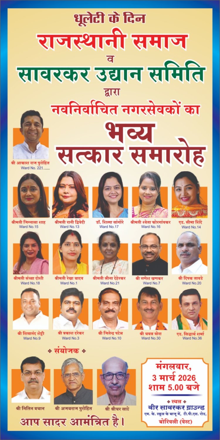 बोरीवली : रंगों के त्योहार होली के शुभ अवसर पर 3 मार्च की शाम राजस्थानी समाज-बोरीवली और वीर सावरकर उद्यान समिति 'होली स्नेह-मिलन' का आयोजन तथा 'नव निर्वाचित नगरसेवकों का भव्य सत्कार' करने जा रही है। यह आयोजन लोक संस्कृति और एकता का प्रतीक है, जहां समाज के लोग एक साथ आकर रंगों के त्योहार का जश्न मनाएंगे और चुने गए विभिन्न वार्ड के नए नेतृत्व (नगरसेवकों) का भव्य सत्कार करेंगे।