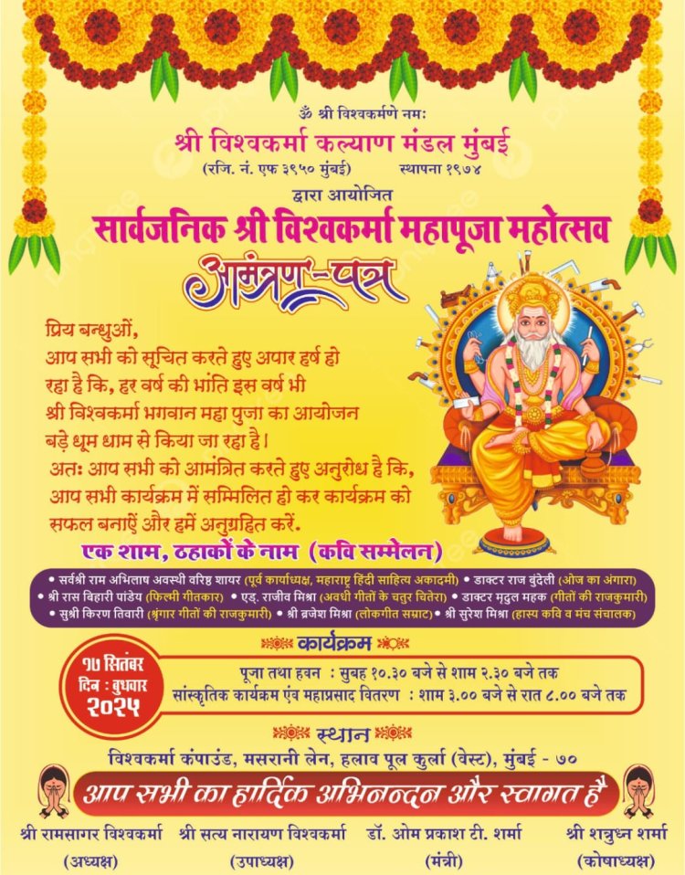 कुर्ला (मुंबई) : श्री विश्वकर्मा कल्याण मंडल मुंबई द्वारा सत्रह सितंबर 2025 को श्री विश्वकर्मा महापूजा के अवसर पर हलाव पुल, मसरानी लेन कुर्ला (पश्चिम), मुंबई में एक विराट कवि सम्मेलन का आयोजन किया गया है। महापूजा महोत्सव सुबह साढ़े दस बजे से रात आठ बजे तक चलेगी। शाम छह बजे से हास्य कवि सुरेश मिश्र के संचालन में शायर राम अभिलाष अवस्थी, डाक्टर राज बुंदेली, गीतकार रासबिहारी पांडेय, अवधी के कवि एड्.राजीव मिश्र, डाक्टर मृदुल तिवारी महक तथा सुश्री किरण तिवारी अपना काव्यपाठ करेंगे।