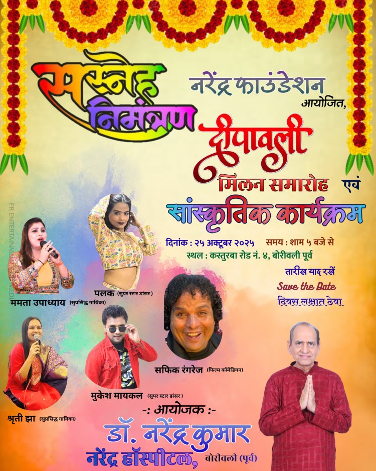 बोरीवली : बोरीवली की प्रसिद्ध संस्था 'नरेंद्र फाउंडेशन' के तत्वावधान में दीपावली स्नेह मिलन तथा सत्कार समारोह का भव्य आयोजन किया जा रहा है। मुख्य आयोजक, समाजसेवी तथा प्रसिद्ध हृदय रोग विशेषज्ञ डॉ. नरेंद्र कुमार ने इस कार्यक्रम की विस्तृत जानकारी देते हुए मीडिया को बताया कि शनिवार, 25 अक्टूबर को शाम 5 बजे से बोरीवली ( पूर्व ) के कस्तूरबा मार्ग क्रमांक-4 पर यह सांस्कृतिक आयोजन होगा।