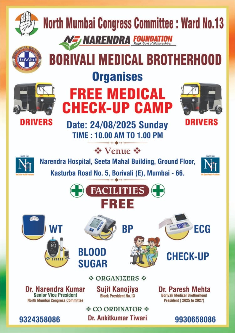 बोरीवली : उत्तर मुंबई जिला कांग्रेस कमिटी वार्ड-13, नरेंद्र फाउंडेशन तथा बोरीवली मेडिकल ब्रदरहुड के संयुक्त तत्वावधान में ऑटो चालकों की मुफ्त स्वास्थ्य जांच के लिए एक शिविर का आयोजन किया जा रहा है।